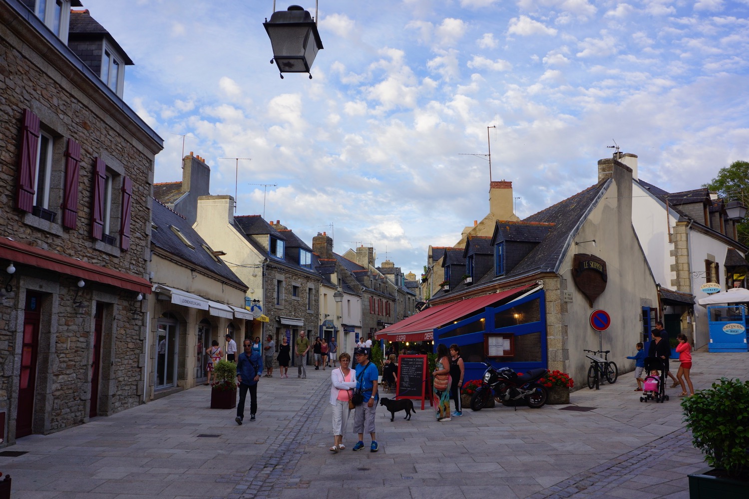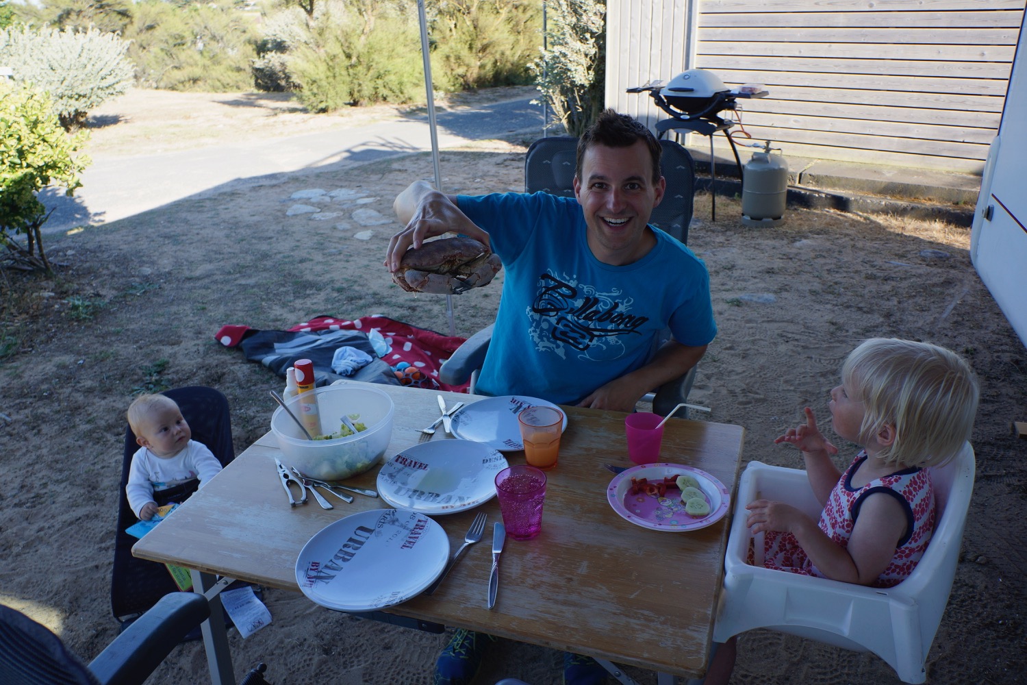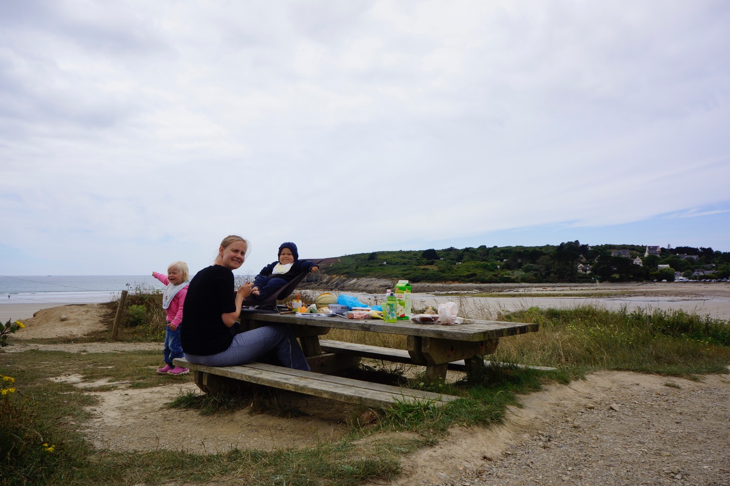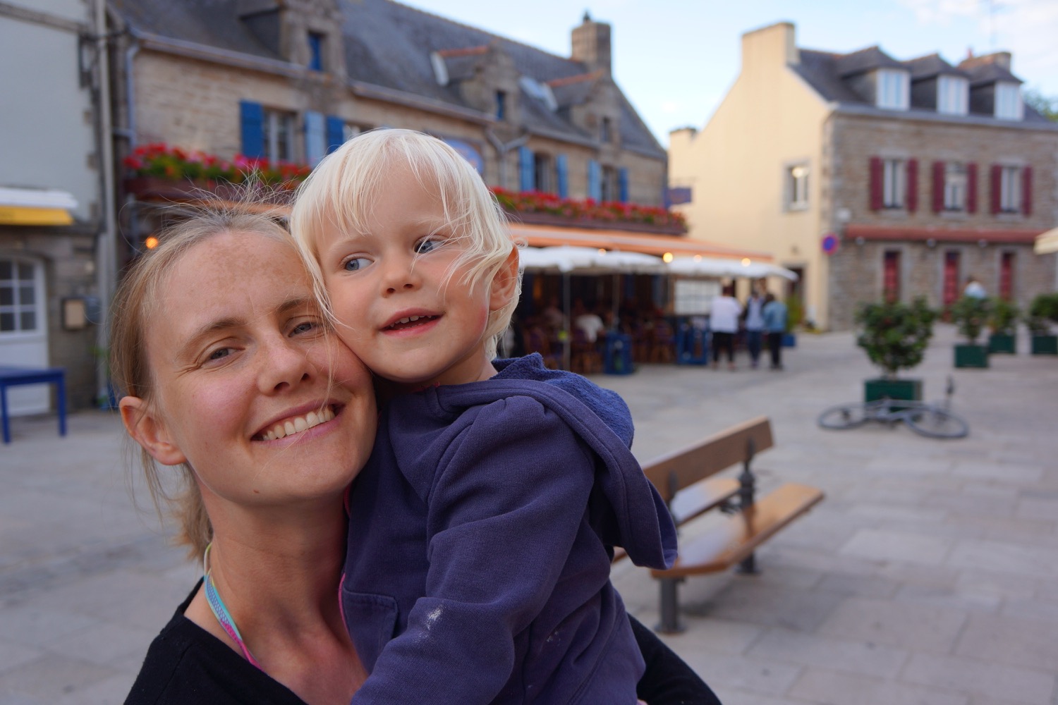 Das nächste Ziel war Concarneau – Dupins neue Heimat im Finistere mussten wir uns natürlich anschauen. Da beide Kinder auf der Fahrt dort hin sehr spät und ausgiebig einen Mittagschlaf gemacht hatten sind wir abends noch ins “Städtchen” gelaufen und haben sehr lecker zu Abend gegessen. Nicht im L’Amiral sondern im Herzen der netten Altstadt am Hafen. Es hat uns so gut gefallen, dass wir noch einen Tag geblieben sind. Tagsüber sind wir nochmal dort auf den Markt gegangen und am Strand vorbei. Ein Stopp in der Apotheke für irgendetwas gegen den ständigen Juckreiz musste auch sein! Mit Babyphone hatten wir dann noch einen netten Abend mit Livemusik. Eine Gitarre, ein Bass, zwei Stimmen mit Englischen Evergreens mit französischen Akzent – sehr liebenswert.