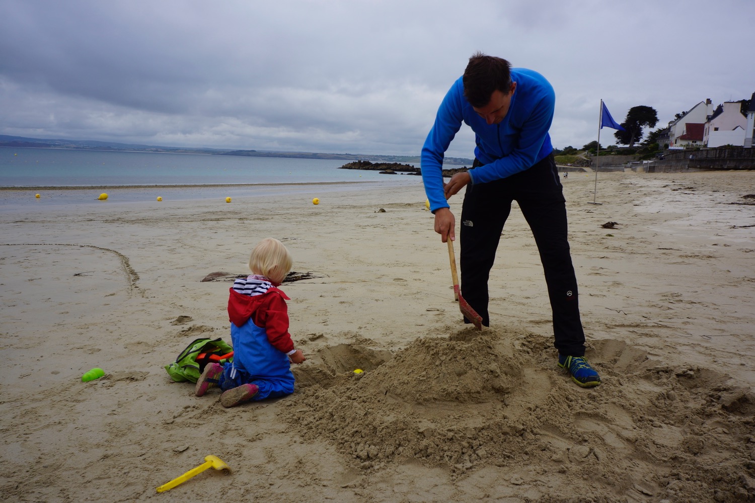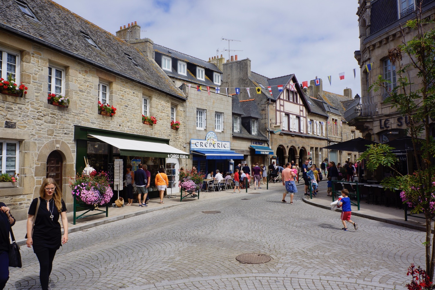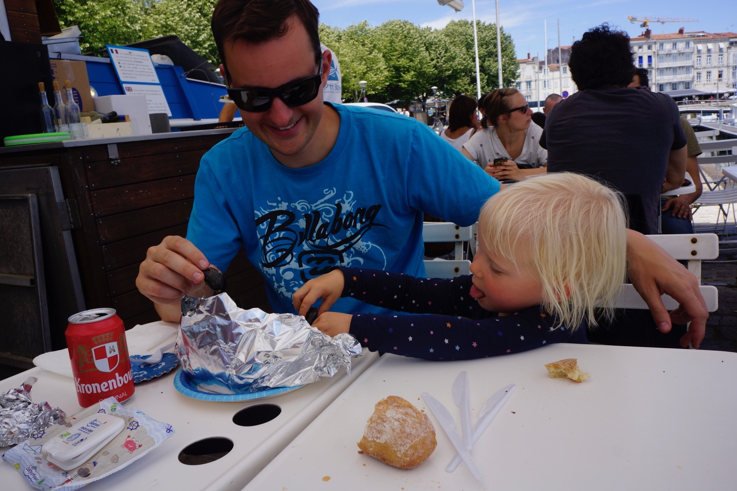 Das nächste Ziel war Concarneau – Dupins neue Heimat im Finistere mussten wir uns natürlich anschauen. Da beide Kinder auf der Fahrt dort hin sehr spät und ausgiebig einen Mittagschlaf gemacht hatten sind wir abends noch ins “Städtchen” gelaufen und haben sehr lecker zu Abend gegessen. Nicht im L’Amiral sondern im Herzen der netten Altstadt am Hafen. Es hat uns so gut gefallen, dass wir noch einen Tag geblieben sind. Tagsüber sind wir nochmal dort auf den Markt gegangen und am Strand vorbei. Ein Stopp in der Apotheke für irgendetwas gegen den ständigen Juckreiz musste auch sein! Mit Babyphone hatten wir dann noch einen netten Abend mit Livemusik. Eine Gitarre, ein Bass, zwei Stimmen mit Englischen Evergreens mit französischen Akzent – sehr liebenswert.