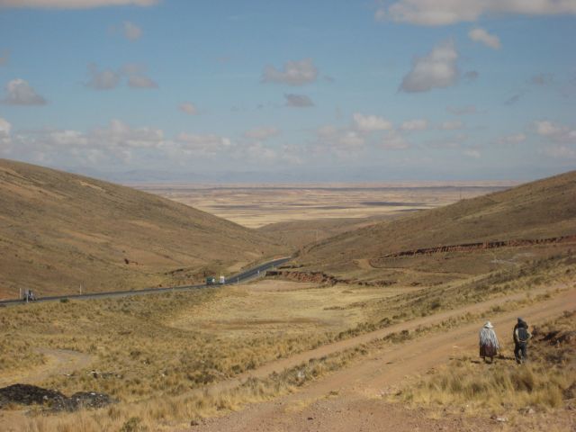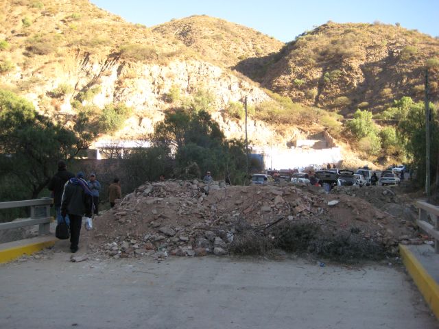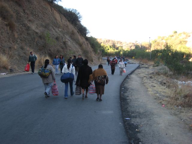 Am naechsten Morgen sind wir also frueh los mit dem Bus um nach Potosi zu kommen. Nach nur 20min Fahrt hiess es dann austeigen und “caminar”. Wir sind nur bis kurz vor die Blockade gefahren worden und mussten dann ca 2km laufen bis wir an die andere Seite der Strassenblockaden kamen. Lustig war es zu sehen wie die Bolivianer aus der Situation das beste machten: Auf beiden Seiten warteten Taxis und Kinder mit Schubkarren, die das Gepaeck fuer ein paar Bolivianos transportierten. Auf der anderen Seite angekommen mussten wir dann erstmal eine Stunde auf den anderen Bus warten, bevor es dann endlich weiter nach Potosi (auf der normalen Route) ging.