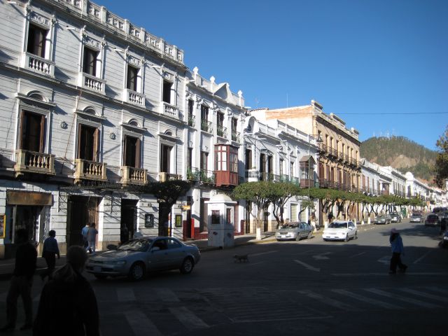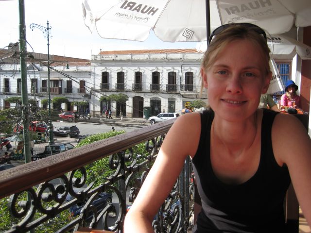 Sucre ist eine huebsche Kolonialstadt, in der es neben vielen Kirchen und ein paar Saurierspuren nicht weiter viel zu sehen gibt. Dafuer war es tagsueber schoen warm, so dass wir uns mit Blick auf die Plaza in einem Cafe gesonnt haben.