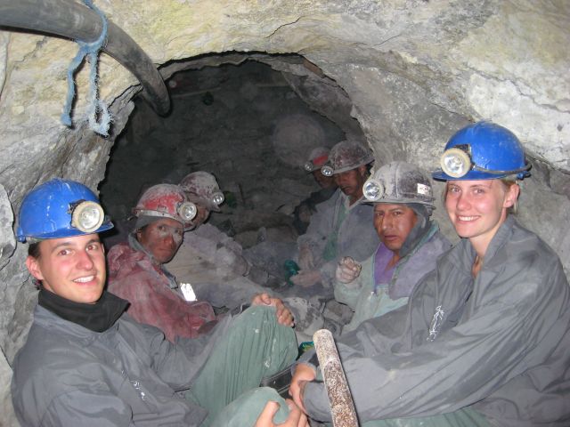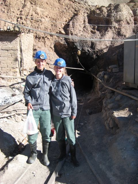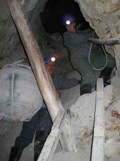 Nachdem wir uns mit Schutzkleidung, Helm und Lampe ausgeruestet hatten ging es in die Miene. Dort hatten wir zunaechst eine Begegnung mit einem ziemlich betrunkenen Kumpel, welcher mit einer Dicken Backe voller Koka-Blaetter uns alles moegliche erzaehlen wollte. Wir haben nur das verstanden, was der Guide uns uebersetzt hat und das war schon ziemlich beeindruckend.
