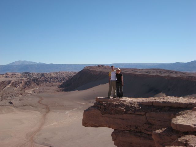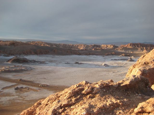 Wie es uns dahin verschlagen hat, wisst ihr ja bereits. Und wo wir schon mal hier sind haben wir uns auch etwas angeschaut. San Pedro an sich ist ein touristisches, verschlafenes Nest. Die “Bevoelkerung” besteht zu 80% aus Touristen, demnach ist auch jedes zweite Haus ein Hostel, ein Reisebuero oder ein Shop. San Pedro besticht eher durch seine Umgebung. Hier koennte man bestimmt gut eine Woche damit verbringen Vulkane zu besteigen, Geisiere zu bewundern, in heissen Quellen zu baden oder andere Landschaftsformen zu besichtigen. Wir haben uns fuer eine Tour ins Valle de la Luna entschieden. Es sieht aus als waere es schneebedeckt, aber mal wieder handelt es sich um Salz. Da wir abends da waren, hatten wir auch einen schoenen Sonnenuntergang.