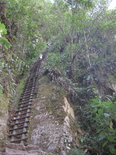 Von Ollanta aus sind wir morgens mit dem Zug nach Aguas Calientes gefahren. Da wir lieber fruehmorgens nach Machupicchu wollten haben wir den Tag genutzt und haben Tickets gekauft und uns das Staedchen angesehen. Das bietet allerdings nicht viel ausser kleinen Laden, Cafes und Restaurants. Deshalb haben Wibke und ich beschlossen den Berg Putucusi zu besteigen, von dem man einen guten Blick auf Machupicchu hat. Der Aufstieg dauerte weniger als 2 Stunden und ging Stufen, Stock und Stein und vor allem Leitern (siehe Bilder). Der Ausblick hat allerdings fuer die Anstrengung entlohnt. Markus ist zu Hause geblieben und hat seine Kraefte geschont sowie die Toilette bewacht. Ansonsten blieb der Tag ereignislos. Ausser der Tatsache, dass der Bankautomat kein Geld mehr hatte, was bei vielen Touristen zu kleinerer und groesserer Verzweiflung gefuehrt hat.