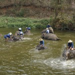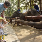 Die erste Station mit dem Mietwagen war das Thai Elefant Conservation Center ca 1h von Chiang Mai entfernt. Man fährt hier links und die Verkehrsregeln sind viel dehnbarer als bei uns, aber es wird sehr rücksichtsvoll gefahren und die Straßen sind sehr gut ausgebaut. Markus schlägt sich prima im Verkehr. Wir sind dann pünktlich zur “Show” bei den Elefanten gewesen. Es wurde etwas auf Baumstämmen balanciert, Bilder gemalt, dem Mahut der Hut aufgesetzt und gezeigt, wie die Elefanten als Arbeitskräfte eingesetzt werden. Das beste war aber das Elefantenbaden im See. Da hat man den Tieren angesehen wie gerne sie im Wasser sind. Man durfte den Tieren dann noch Mais, Zuckerrohr und Bananen füttern. Das war für Hannah dann doch etwas zu naher Kontakt und Papa musste zum Füttern herhalten.