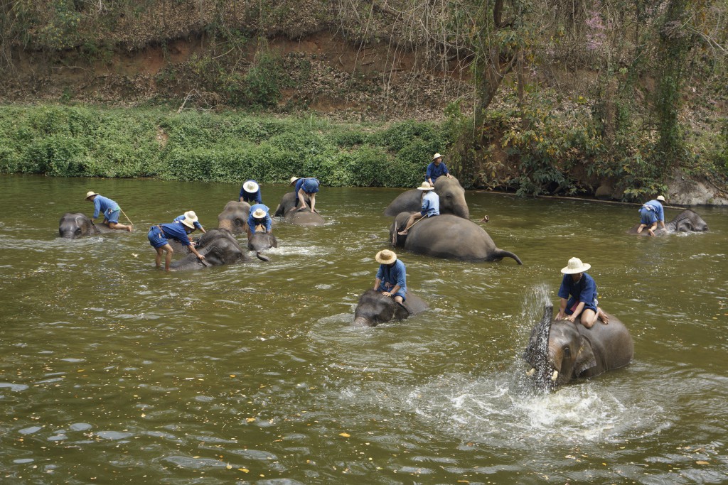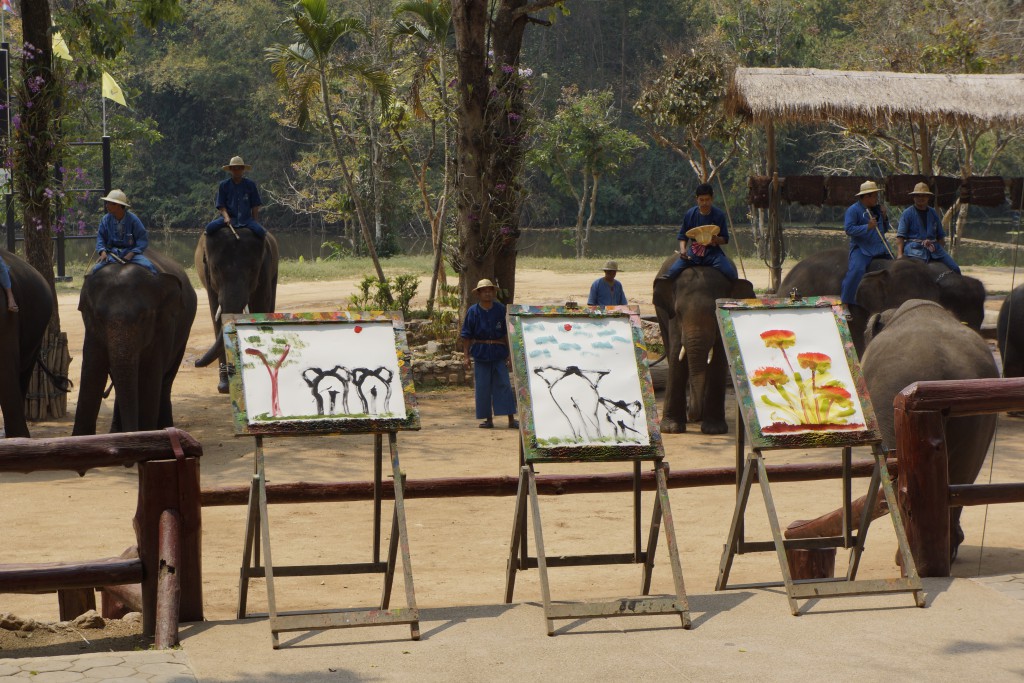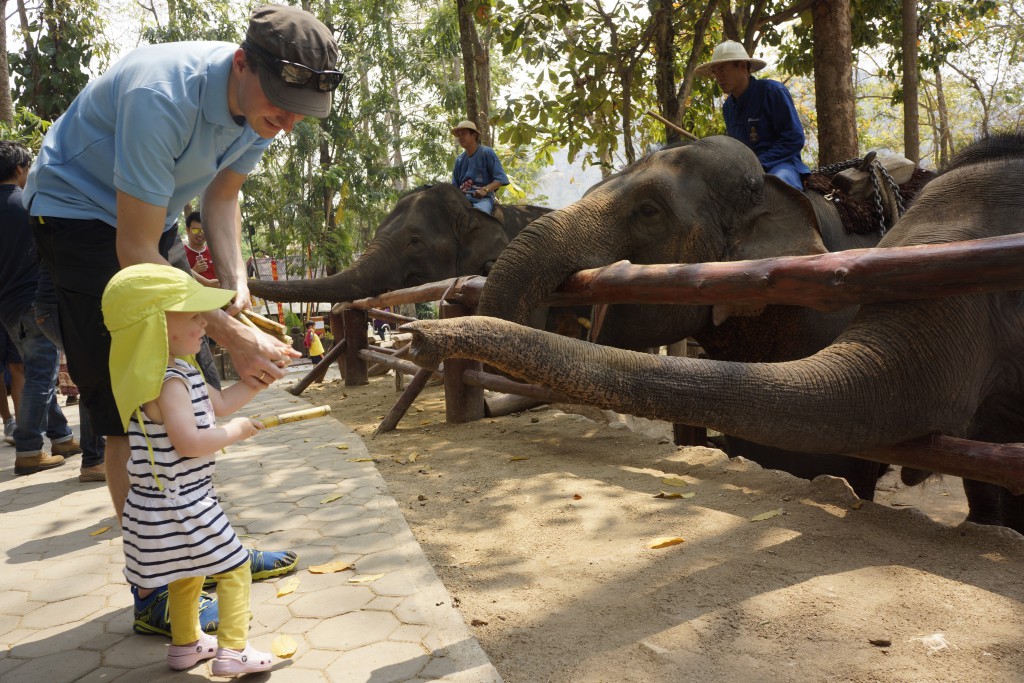 Die erste Station mit dem Mietwagen war das Thai Elefant Conservation Center ca 1h von Chiang Mai entfernt. Man fährt hier links und die Verkehrsregeln sind viel dehnbarer als bei uns, aber es wird sehr rücksichtsvoll gefahren und die Straßen sind sehr gut ausgebaut. Markus schlägt sich prima im Verkehr. Wir sind dann pünktlich zur “Show” bei den Elefanten gewesen. Es wurde etwas auf Baumstämmen balanciert, Bilder gemalt, dem Mahut der Hut aufgesetzt und gezeigt, wie die Elefanten als Arbeitskräfte eingesetzt werden. Das beste war aber das Elefantenbaden im See. Da hat man den Tieren angesehen wie gerne sie im Wasser sind. Man durfte den Tieren dann noch Mais, Zuckerrohr und Bananen füttern. Das war für Hannah dann doch etwas zu naher Kontakt und Papa musste zum Füttern herhalten.