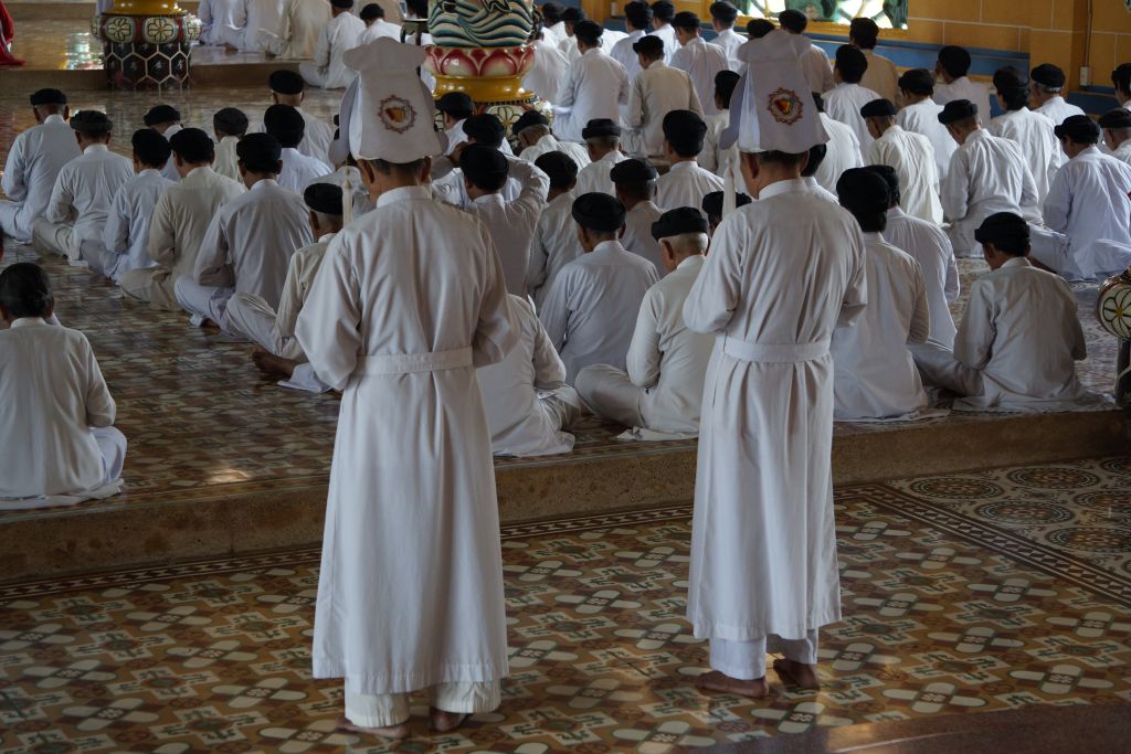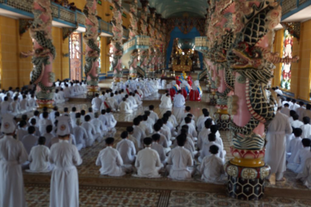 Da die Stadt nicht viele bis keine Sehenswuerdigkeiten hat sind wir am zweiten Tag zu den Tunneln gefahren, die waehrend des Krieges genutzt wurden und an einem Tempel vorbei, der irgendwas mit Victor Hugo zu tun hat und sehr nach einer Sekte aussieht. Die Religion des Caodaismus ist allerdings hier im Sueden von Vietnam weit verbreitet. Wir konnten dem Gottesdienst zuschauen. Es war wie in einem Zoo bei der Tierfuetterung zuzuschauen – ein komisches Erlebnis.